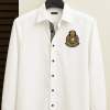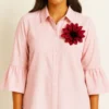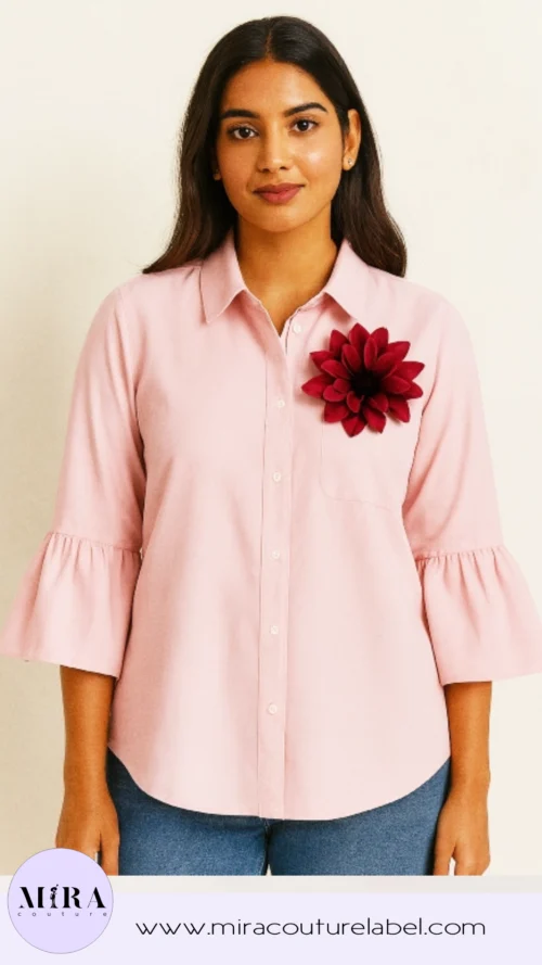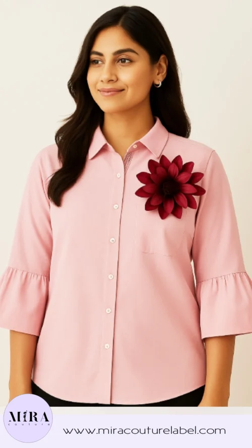 Elegance stitched in pink, confidence pinned in bloom 🌸 Ruffles, roses & a whole lot of pretty. This shirt is a light pink button-down with a structured collar and a front pocket. The sleeves are designed with a ruffled flare detail at the ends, giving it a feminine touch. What stands out most is the large dark pink artificial flower brooch pinned on the pocket area, adding a bold and stylish accent to the otherwise simple shirt.