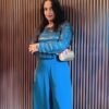 Step into effortless sophistication with this elegant teal blue silk co-ord set, designed to blend modern flair with timeless grace. The ensemble features a beautifully crafted metallic-striped top that adds a subtle shimmer, making it perfect for festive evenings and celebrations.