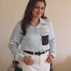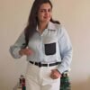 Elevate your wardrobe with this sophisticated shirt in a serene light blue hue. Designed with a sleek button-down front, it features a striking black pocket accented with crystal detailing and a matching embellished collar. The luxe finish adds a soft sheen, making it perfect for both formal and evening wear.