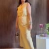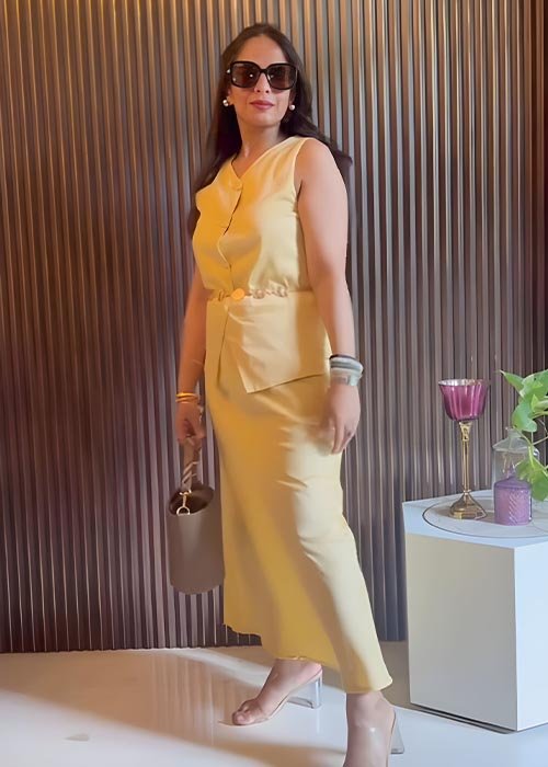 A sleeveless butter yellow waist cord with a V-neck and buttoned front. You can highlighted with an embellished belt-like floral detail. The outfit has a structured, elegant cut with a straight skirt.