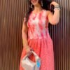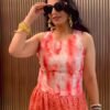 The top features a fluid, watercolor-inspired marble print in hues of peach, coral, and ivory, crafted from a smooth satin-finish fabric that catches the light beautifully. It is perfectly complemented by a high-waisted, floor-length skirt in a vibrant coral shade, boasting a unique embossed texture that adds depth and luxury to the silhouette. Whether you’re attending a garden party, a tropical resort dinner, or a festive celebration, this ensemble offers a sophisticated yet playful aesthetic.