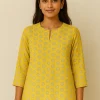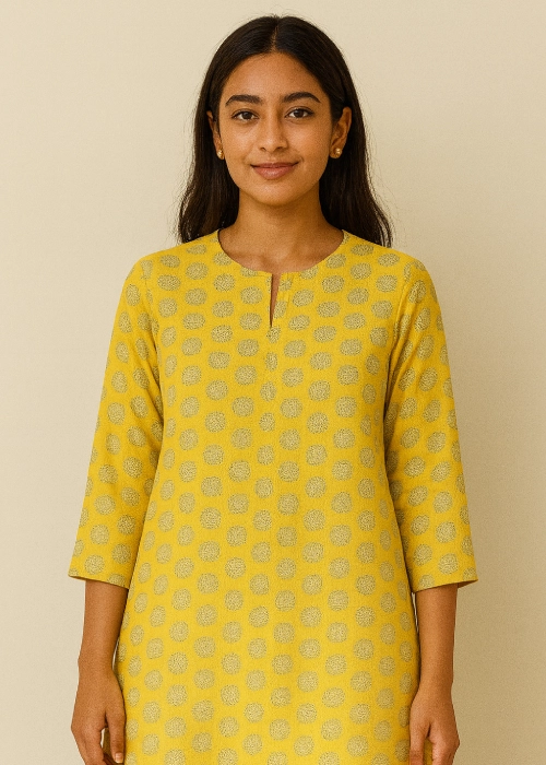 A vibrant yellow kurta adorned with delicate golden foil prints, perfect for light festive occasions. Its versatile charm allows you to dress it up with heavy jewelry or keep it subtle with minimal accessories. Style it with green or golden tulip pants or harem pants for a graceful and trendy festive look. πΈπ